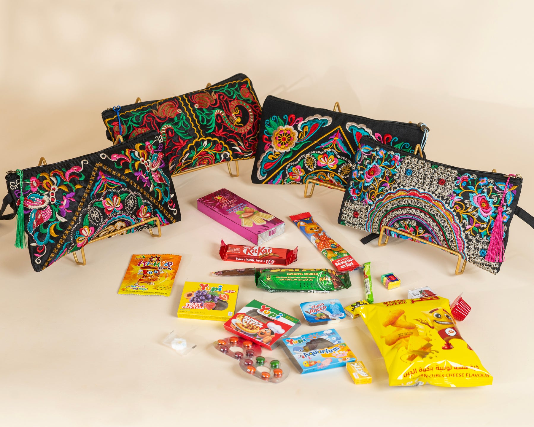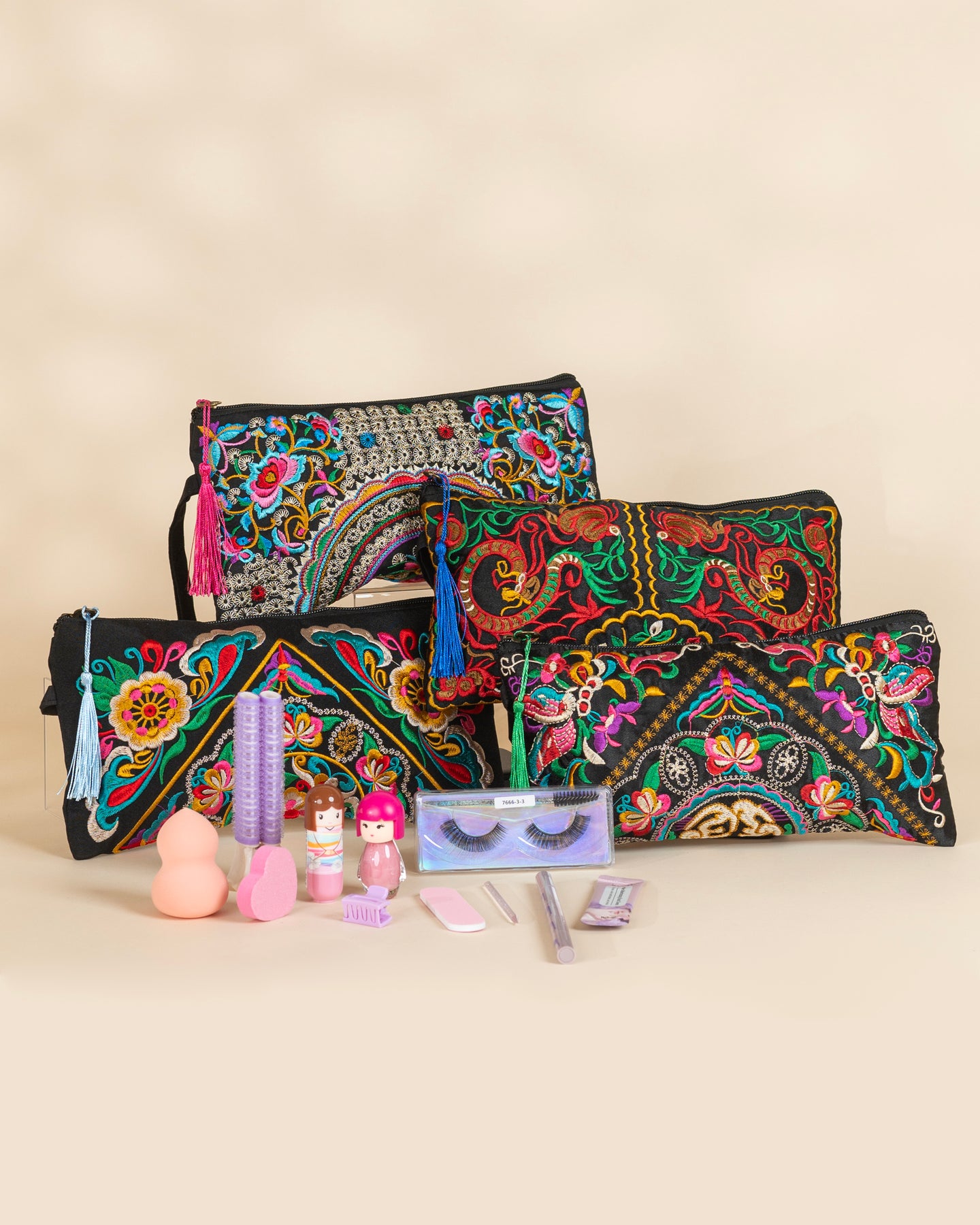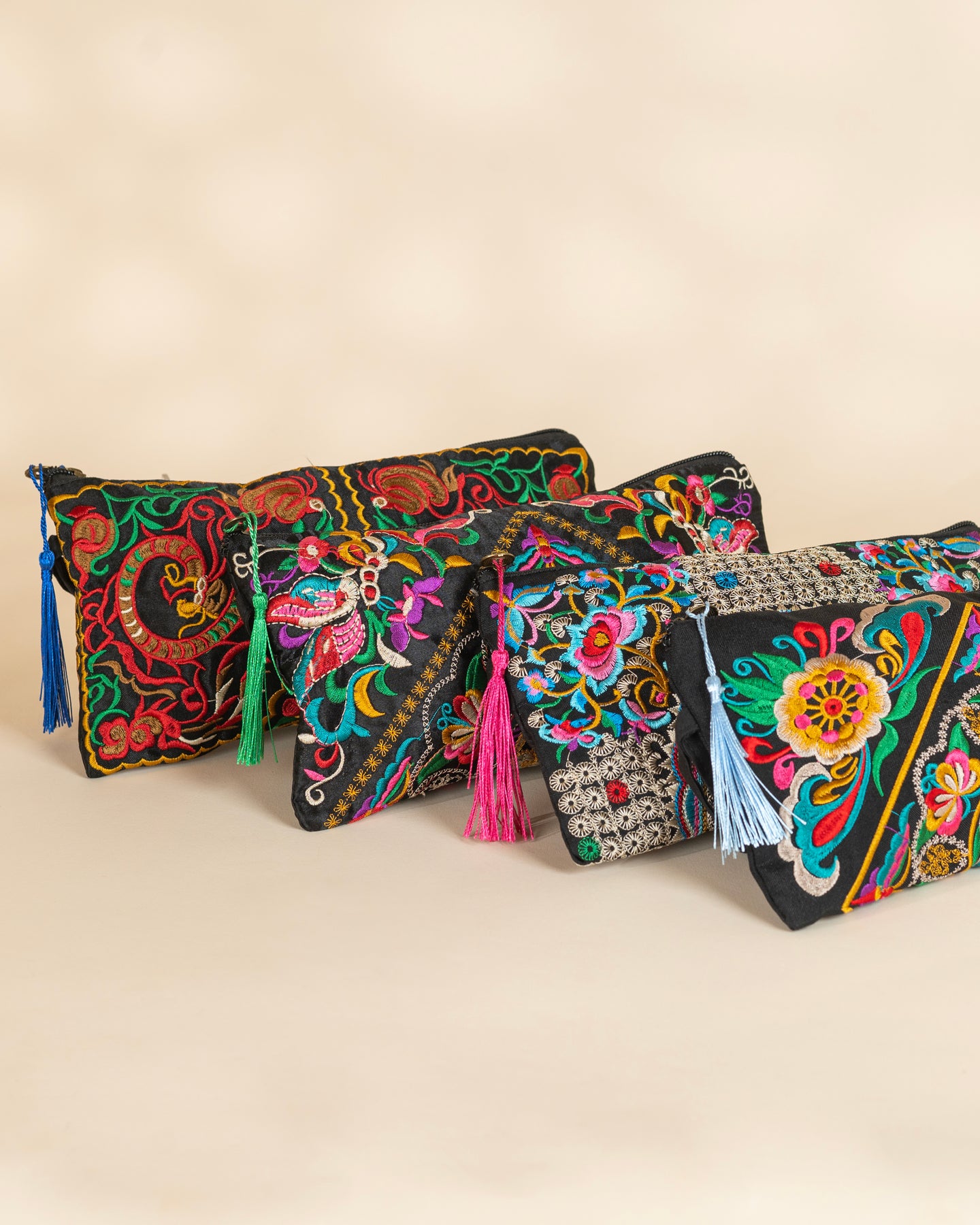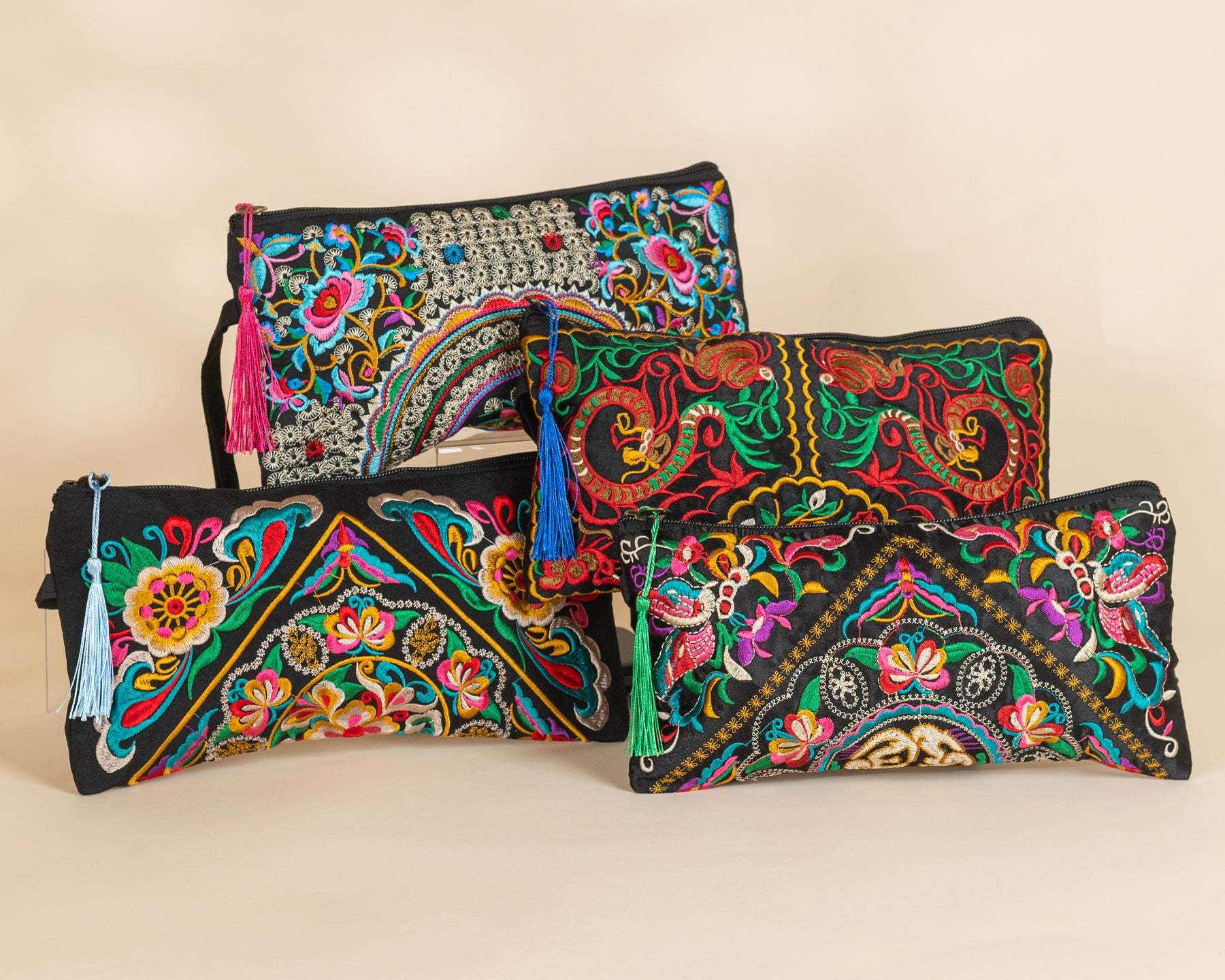 Each bag features rich, hand-stitched embroidery in radiant hues inspired by Eastern and bohemian art, beautifully finished with a playful colorful tassel for an elegant yet expressive touch.