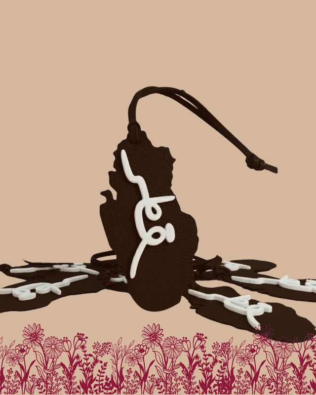 في الصورة نشوف تعليقة جلدية أنيقة مصممة على شكل خريطة قطر بلون بني دافئ يوحي بالفخامة، ومزيّنة بخط عربي أبيض بارز يعطيها طابع راقٍ ومميز.