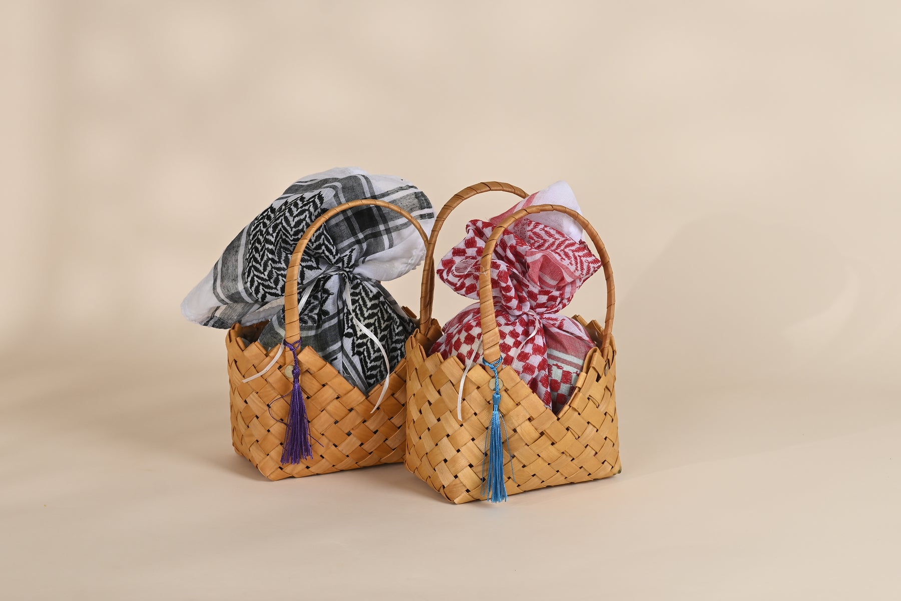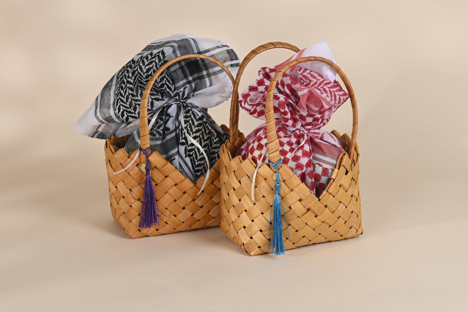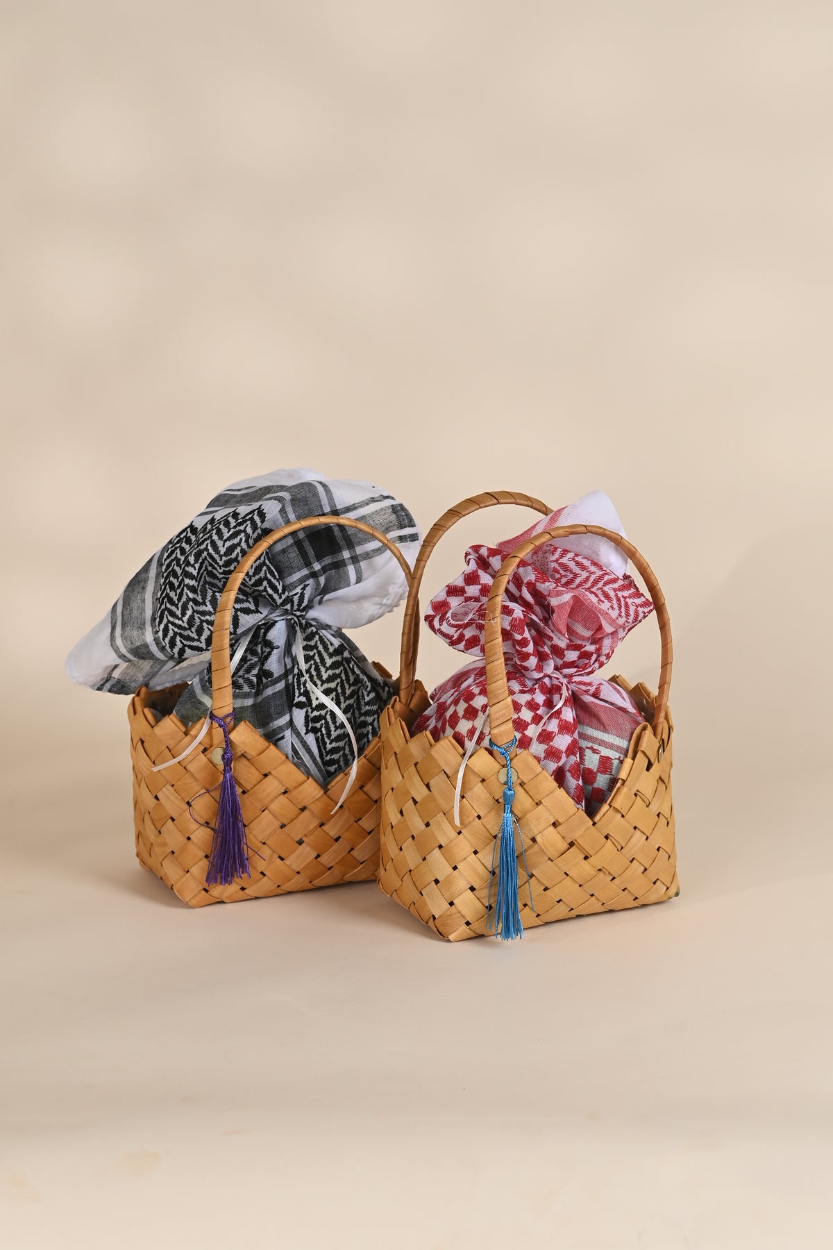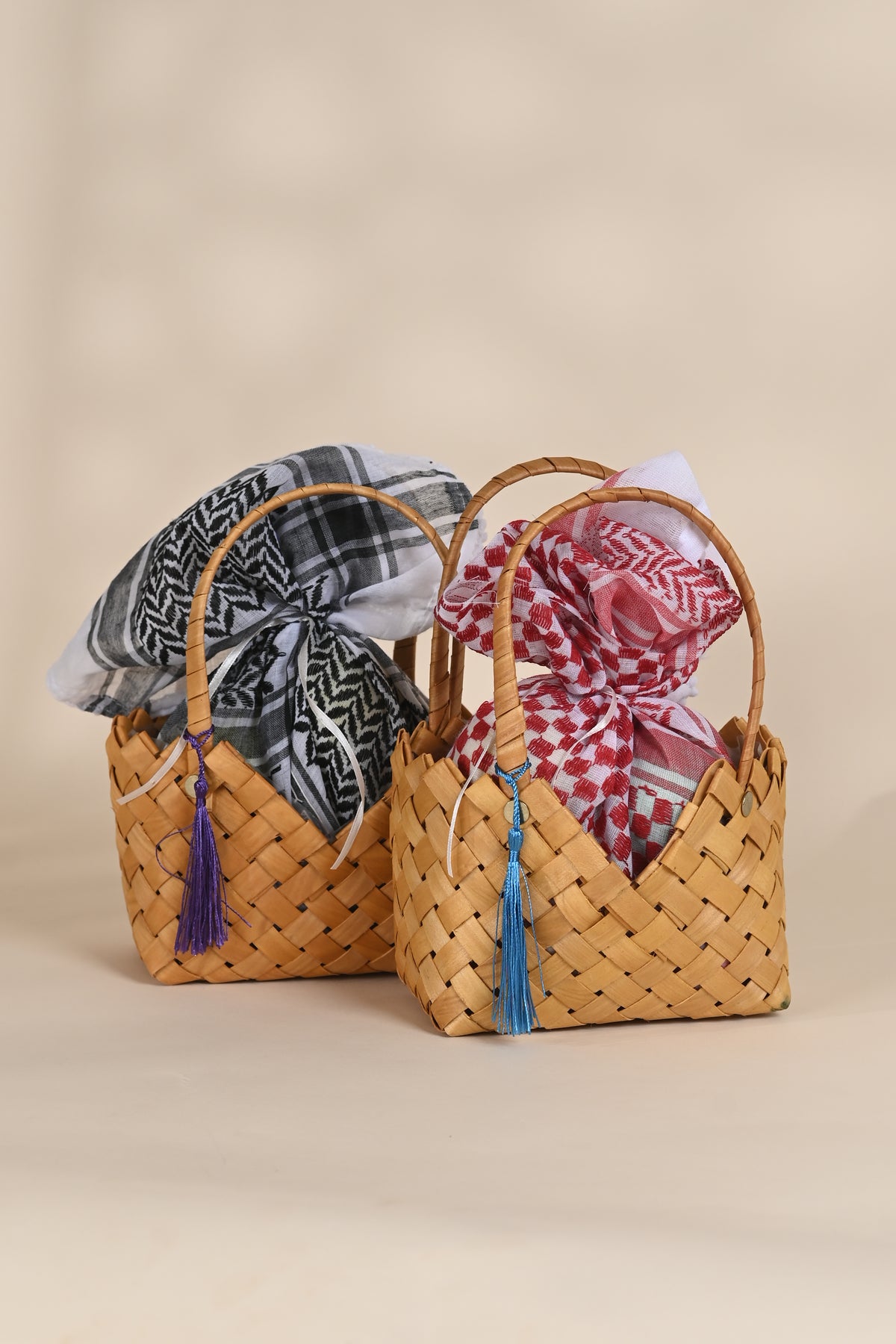 Each basket is handcrafted from natural palm fronds and adorned with a traditional keffiyeh scarf (available in red or black), blending authenticity and elegance in perfect harmony.